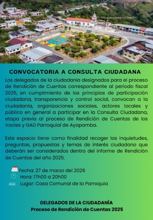 «Mediante este Plan de Desarrollo y Ordenamiento Territorial comprometemos nos generar a oportunidades de desarrollo que mejoren la calidad de vida de cada habitante de la Parroquia Ayapamba, fundamentadas en principios de justicia social, equidad e inclusión participativa. Priorizando obras donde se transparente cada inversión, promoviendo así una administración solidaria y responsable con la comunidad.»